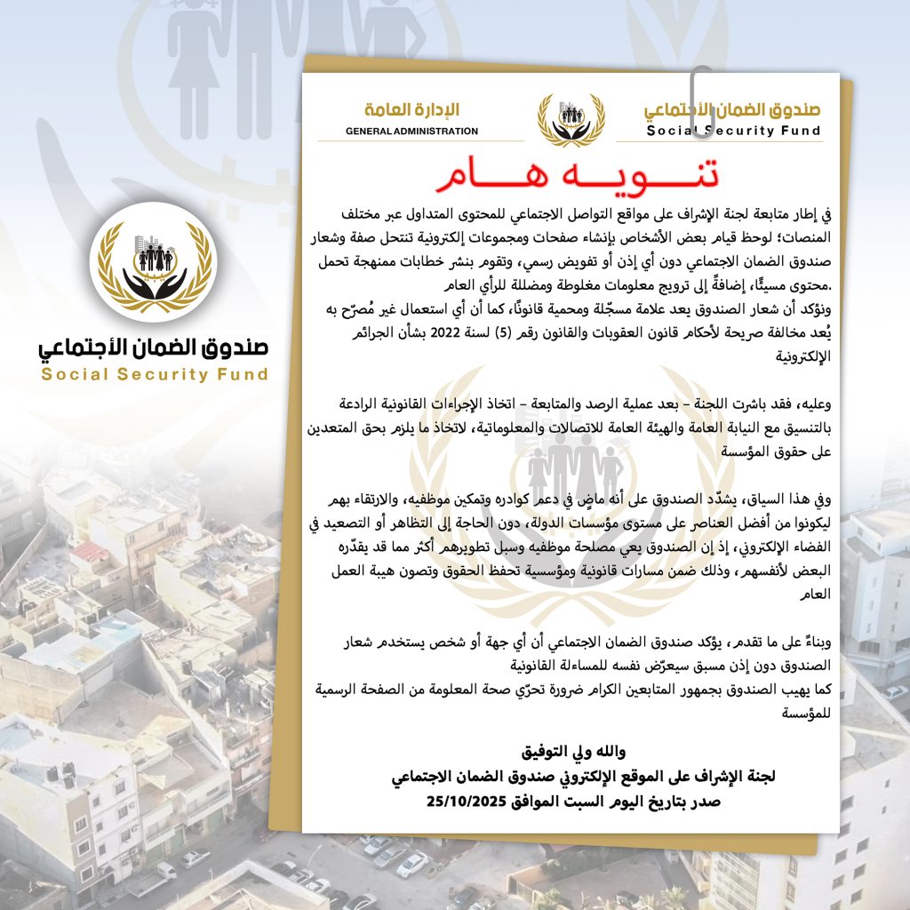 تنفي إدارة الإعلام والتوعية بصندوق الضمان الاجتماعي أي علاقة لها بالروابط التي يتم تداولها عبر مواقع التواصل الاجتماعي، والتي تزعم تقديم منحة مالية باسم الصندوق.